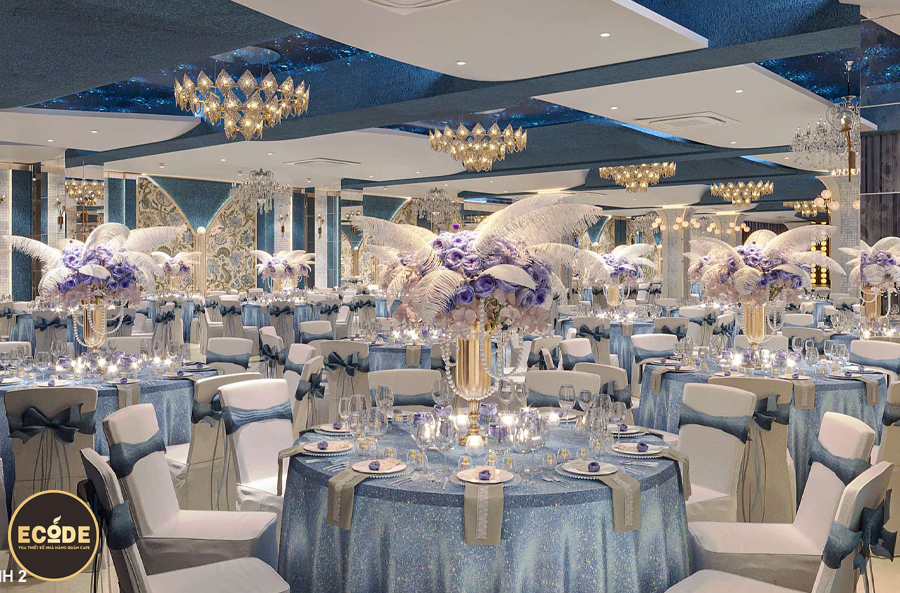 Thiết kế nhà hàng tiệc cưới đẹp chuyên nghiệp được ECODE triển khai với đầy đủ các yếu tố công năng quan trọng để giúp bữa tiệc đám cưới, đám hỏi, sinh nhật được diễn ra trang trọng và đầy đủ nhất với công năng chính sau đây: